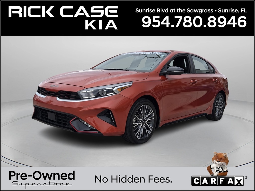 Priced below KBB Fair Purchase Price! CARFAX One-Owner. Clean CARFAX. 10 year or 100,000 mile Powertrain Warranty, 150 Point Inspection, Bluetooth, Kia Certified, BACK UP CAMERA, Unlimited Car Wash, Rick Case Rewards, 10-Way Power Driver's Seat, 17" x 7.0J Alloy Wheels, Alloy wheels, Apple CarPlay & Android Auto, Brake assist, Delay-off headlights, Electronic Parking Brake (EPB), Electronic Stability Control, Exterior Parking Camera Rear, Forward Collision Avoidance-Assist - Cyclist, Front fog lights, GT-Line Premium Package, GT-Line Sport Premium Package, Heated & Ventilated Front Seats, LED Interior Lighting, Navigation System, Navigation-Based Smart Cruise Control (NSCC), Panic alarm, Power Sunroof, Radio: harman kardon Premium Audio, Rear AC Vent, Rear USB Charger, Security system, Smart Cruise Control w/Stop & Go, SynTex Seat Trim, Traction control, Wireless Charging. Certified. Fire Orange 2023 Kia Forte GT-Line FWD CVT 2.0L I4 MPI Kia Certified Pre-Owned Details: