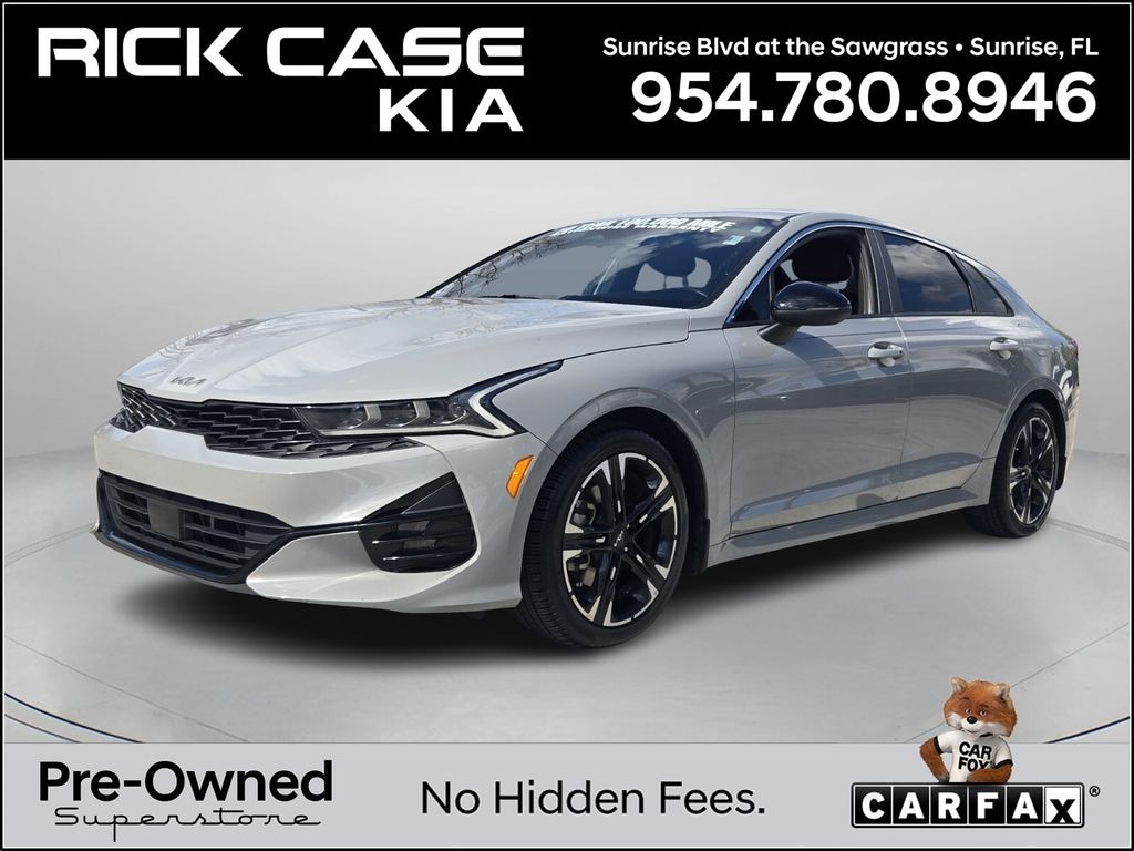 Priced below KBB Fair Purchase Price! CARFAX One-Owner. 150 Point Inspection, Bluetooth, iPod Connector, Kia Certified, Leather, Navigation, BACK UP CAMERA, Unlimited Car Wash, Rick Case Rewards, 4-Wheel Disc Brakes, ABS brakes, Air Conditioning, Apple CarPlay & Android Auto, Brake assist, Dual front impact airbags, Dual front side impact airbags, Electronic Stability Control, Forward Collision Avoidance-Assist, Four wheel independent suspension, Front anti-roll bar, GT-Line Premium Package, GT-Line Red Interior Package, Highway Driving Assist, Knee airbag, LED Projection Headlamps, Low tire pressure warning, Navigation System, Occupant sensing airbag, Overhead airbag, Power driver seat, Rear anti-roll bar, Rear side impact airbag, Rear window defroster, Smart Cruise Control w/Stop & Go, Tachometer, Telescoping steering wheel, Tilt steering wheel, Trip computer, Wheels: 18" Gloss Black Machined Finish Alloy. Certified. Wolf Gray 2023 Kia K5 GT-Line AWD 8-Speed Automatic 1.6L I4 DGI Turbocharged DOHC 16V LEV3-ULEV70 180hp Kia Certified Pre-Owned Details: