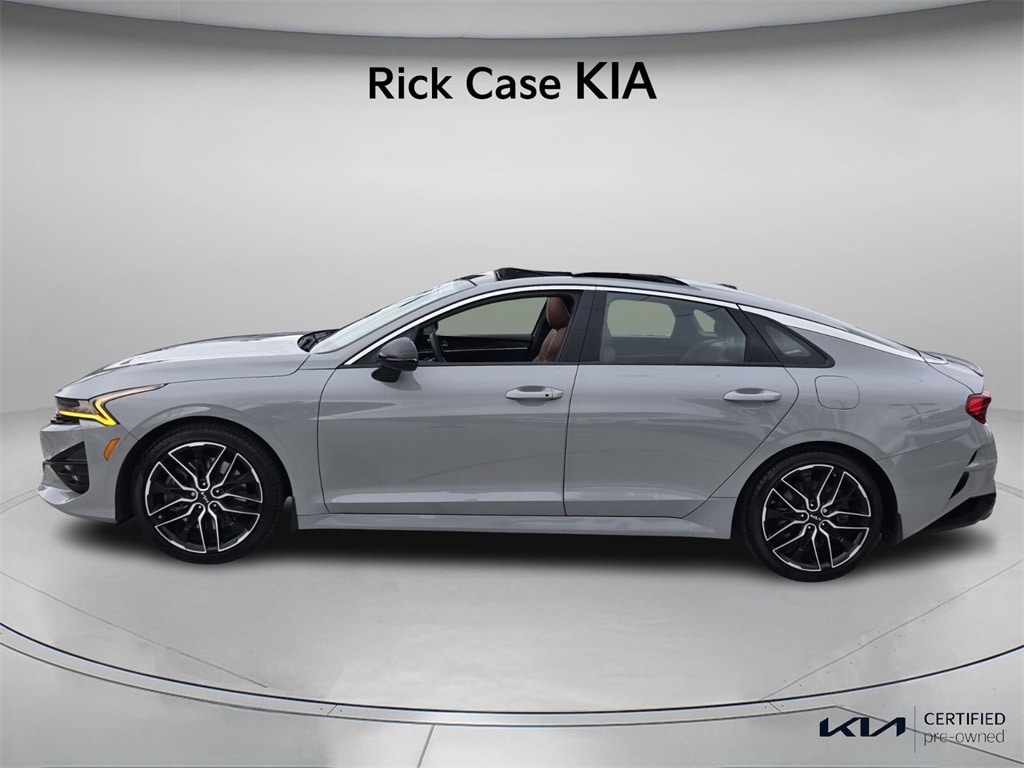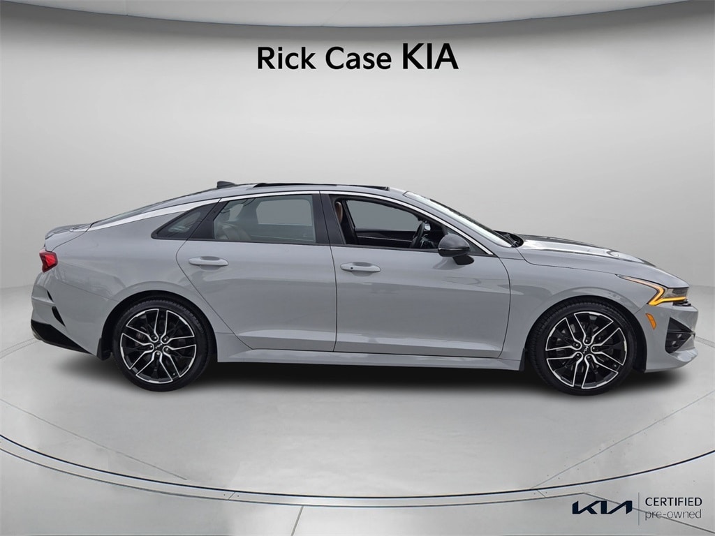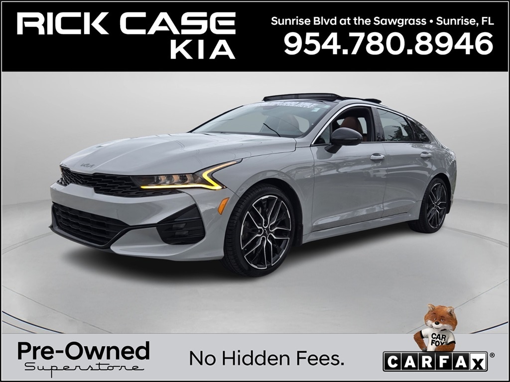 CARFAX One-Owner. Clean CARFAX. 150 Point Inspection, Bluetooth, Kia Certified, Leather, Navigation, BACK UP CAMERA, Unlimited Car Wash, Rick Case Rewards, GT Chestnut Brown Interior Package, 4-Wheel Disc Brakes, 6 Speakers, ABS brakes, Apple CarPlay & Android Auto, Brake assist, Dual front impact airbags, Dual front side impact airbags, Electronic Stability Control, Emergency communication system, Front anti-roll bar, GT Brown Color Package, Knee airbag, Low tire pressure warning, Navigation System, Occupant sensing airbag, Overhead airbag, Power moonroof, Radio: AM/FM/MP3 Audio System, Rear anti-roll bar, Rear side impact airbag, Tachometer, Telescoping steering wheel, Tilt steering wheel, Trip computer. Certified. Wolf Gray 2023 Kia K5 GT FWD 8 Speed Dual Clutch 2.5L I4 DGI Turbocharged DOHC 16V LEV3-ULEV70 290hp Kia Certified Pre-Owned Details: