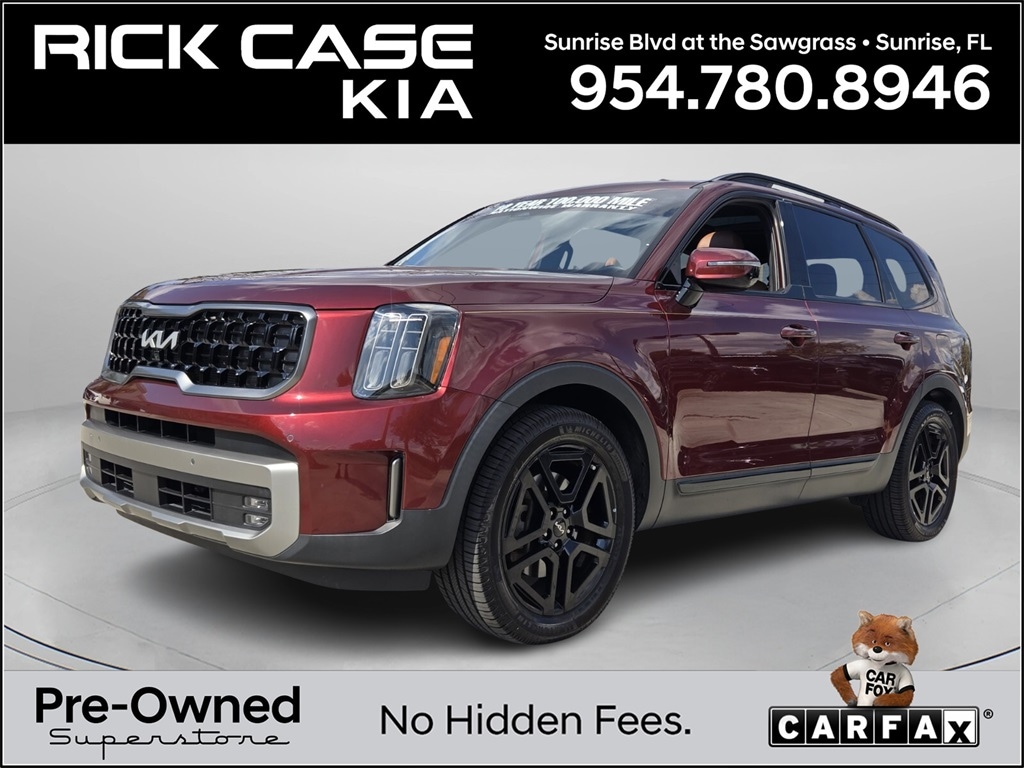 Recent Arrival! 150 Point Inspection, Bluetooth, iPod Connector, Kia Certified, Leather, Navigation, Power Sunroof, Reverse Sensing, sirius xm radio, Panoramic Roof, BACK UP CAMERA, Unlimited Car Wash, Rick Case Rewards, 10 Speakers, 4-Wheel Disc Brakes, ABS brakes, Air Conditioning, Apple CarPlay & Android Auto, Auto-leveling suspension, Dual front impact airbags, Dual front side impact airbags, Emergency communication system: 911 Connect, Exterior Parking Camera Rear, Four wheel independent suspension, Front anti-roll bar, Front dual zone A/C, harman/kardon® Speakers, Heated & Ventilated Front Bucket Seats, Knee airbag, Low tire pressure warning, Memory seat, Navigation System, Occupant sensing airbag, Overhead airbag, Power Liftgate, Power moonroof, Radio: AM/FM harman/kardon Audio System, Rear air conditioning, Rear anti-roll bar, Rear audio controls, Rear side impact airbag, Rear window defroster, Smart Key w/ Push Button and Remote Start, Wheels: 20" x 7.5" Black Finish X-LINE Exclusive. Certified. Dawning Red 2023 Kia Telluride SX X-Line AWD 8-Speed Automatic 3.8L V6 DGI DOHC Dual CVVT Kia Certified Pre-Owned Details: