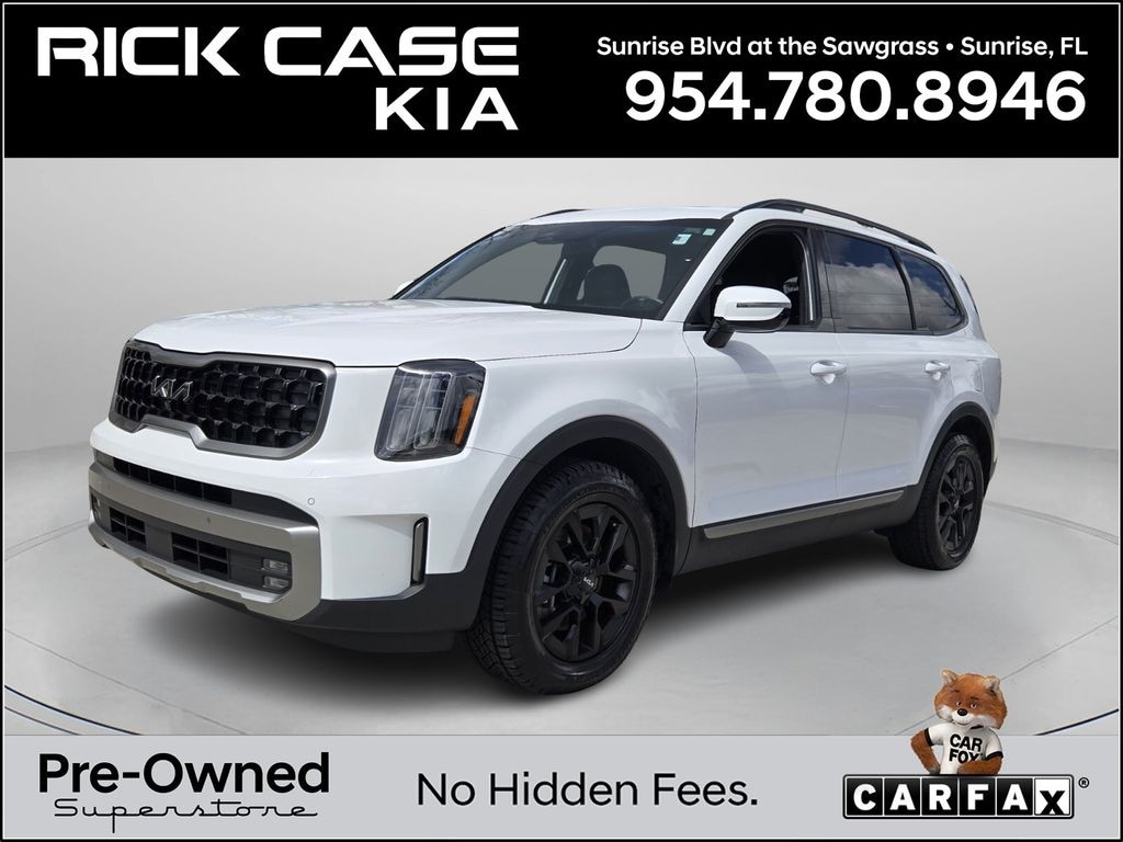 CARFAX One-Owner. Clean CARFAX. 10 year or 100,000 mile Powertrain Warranty, 150 Point Inspection, Kia Certified, Unlimited Car Wash, Rick Case Rewards, 4-Wheel Disc Brakes, ABS brakes, Alloy wheels, Apple CarPlay & Android Auto, Auto-dimming Rear-View mirror, Automatic temperature control, Delay-off headlights, Exterior Parking Camera Rear, Front dual zone A/C, Front fog lights, Navigation System, Panic alarm, Power Liftgate, Power moonroof, Security system, Speed control, Wheels: 18" x 7.5" Black Finish X-PRO Exclusive. Certified. Glacial White Pearl 2023 Kia Telluride SX X-Pro AWD 8-Speed Automatic 3.8L V6 DGI DOHC Dual CVVT Kia Certified Pre-Owned Details: