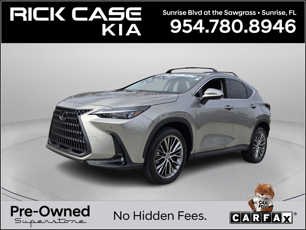 Priced below KBB Fair Purchase Price! CARFAX One-Owner. Clean CARFAX. 10 year or 100,000 mile Powertrain Warranty, 150 Point Inspection, BACK UP CAMERA, Unlimited Car Wash, Rick Case Rewards, 10 Speakers, 4-Wheel Disc Brakes, ABS brakes, Air Conditioning, Anti-whiplash front head restraints, Dual front impact airbags, Dual front side impact airbags, Emergency communication system: Safety Connect (up to 10-year trial subscription included), Exterior Parking Camera Rear, Front anti-roll bar, Front dual zone A/C, Kick Auto Open/Close Door, Knee airbag, Low tire pressure warning, Memory seat, Navigation system: Drive Connect Cloud Navigation (subscription required), Occupant sensing airbag, Overhead airbag, Panic alarm, Power passenger seat, Radio: 10-Speaker Sound System, Rear anti-roll bar, Rear window defroster, Security system, Split folding rear seat, Ventilated front seats, Wireless Apple CarPlay/Wireless Android Auto, Wireless Smart Door Lock. Atomic Silver 2023 Lexus NX 350h Premium AWD eCVT 2.5L I4 DOHC 16V